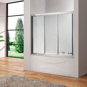 Верхняя направляющая крепится к вертикальным стойкам на высоте около 120-140 см, а нижняя – к борту ванны. Стыки между стеной и стойкой уплотняются при помощи силиконового герметика. В раму вставляется три створки: подвижная (устанавливается по центру) и две неподвижных.