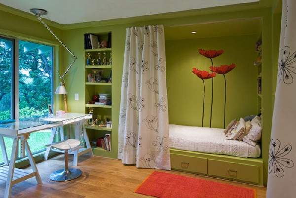 В большинстве случаев, девичьи комнатушки принято оформлять светлыми оттенками красного тона, но вполне можно отойти от стереотипов, наполнив пространство желтыми, нежно-зелеными цветами и их оттенками (кстати, такая палитра помогает ребенку сконцентрировать внимание).