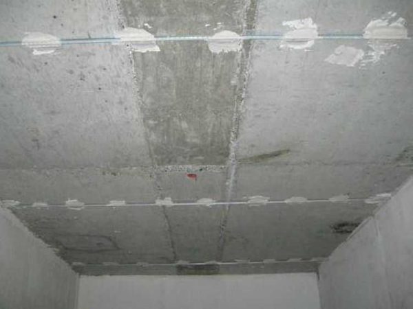 Если потолок из железобетонных плит с большими рустами, их заделывают. После высыхания раствора на рустах, на чистую поверхность наносится грунтовка. через 24 часа работы можно продолжать.