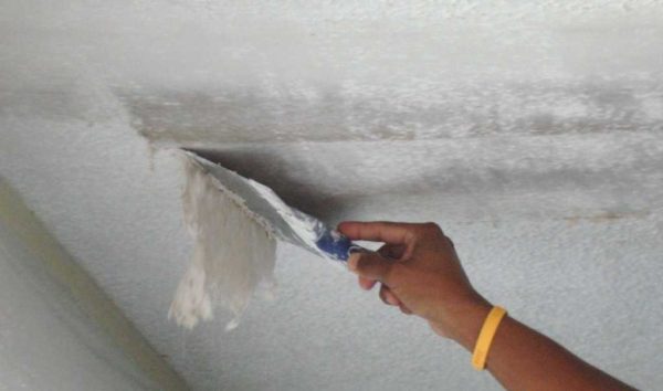 Сначала потолок очищают от всех имеющихся отделочных материалов, вплоть до голого бетона. После с поверхности удаляют пыль. Если есть строительный пылесос (не бытовой, он забьется), удобно работать им, если нет — просто большой кистью убрать всю пыль и песок.