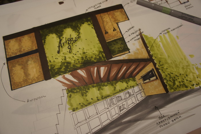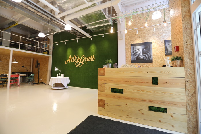 Гордость студии — стена из травы, на которой размещен деревянный логотип «ArtedeGrass”, в ней передана суть идеи названия! Задача заключалась в креплении логотипа на стену из травы, но на то мы и дизайнеры, чтобы решать проблемы подобного характера. В итоге логотип крепко и гармонично разместился на стене» — рассказывает о проекте сам дизайнер Даниэль Петросян.