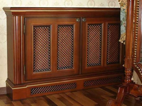 • Деревянные решетки и экраны. Древесина всегда была и остается материалом премиум класса. Высокая пластичность материала позволяет делать их в разных стилях и формах. И хоть и из дерева есть недорогие изделия, смотрятся они очень неплохо. Но, как говорилось выше, работать закрытый со всех сторон древесиной радиатор, передает в помещение мало тепла.
