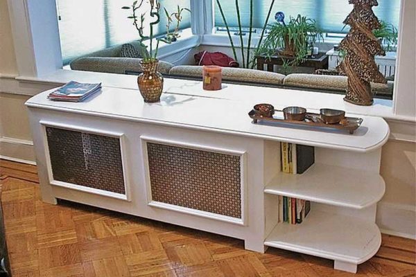 • Решетка-короб. С точки зрения отопления — далеко не лучший вариант, так как циркуляция воздуха затруднена. Ставят если требуется закрыть и боковые части радиатора. Эти решетки могут быть сделаны в виде какого-то предмета мебели, чаще всего — комода или шкафчика. Если они при этом могут стоять самостоятельно, без опоры (как а фото внизу), из называют еще приставными. Также есть короба, которые требуют фиксации на стене — они не имеют ножек. Для лучшего отведения тепла под крышкой и над полом в решетке-коробе делают щель шириной 3-5 см. Неплохо и в верхней крышке сделать отверстие.
