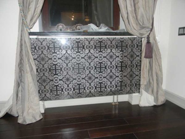 • Стеклянные экраны на радиаторы появились несколько лет назад. Они неидеальны с точки зрения отопления, но имеют привлекательный вид. Делают их из особого закаленного стекла, матируют или наносят рисунок.