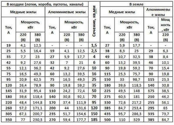 Как таблицей пользоваться? Если решили укладывать медные провода, напряжение ввода 220 В, то для внутренней проводки подойдет левая ее часть, соответствующий столбец. Сравнивать будет найденную мощность всех подключаемых к группе потребителей (ее найти и посчитать проще). В той части, где речь идет о медных проводах, укладываемых  в лотки, пустоты, каналы, столбце «220 В» находите  ближайшее большее значение. По этой строчке двигаетесь вправо до колонки «Сечение, кв. мм». Указанная тут цифра и будет требуемым размером жил. Из проводников этого диаметра нужно будет делать электрическую проводку от автомата до розеток или выключателей.