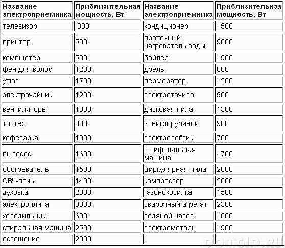 Средние значения мощностей приборов для расчета суммарной нагрузки на электропроводку частного дома своими руками