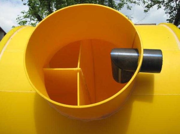 Две камеры — это лучше чем одна, даже несмотря на то, что разделена она вертикально. Надо заметить, что в обычной комплектации приваривается горловина 300 мм высотой (по заказу могут сделать 500 мм высотой). Малой высоты горловина не всегда удобна. Канализационные трубы должны от дома идти под уклоном около 2 см на метр. По санитарным нормам септики должны находится довольно далеко от дома. Если он на расстоянии не более 10 метров, данной горловины вам хватит ( входной патрубок отнимает не менее 10 см). Если же нет, придется что-то мудрить или просить приварить более высокую горловину.