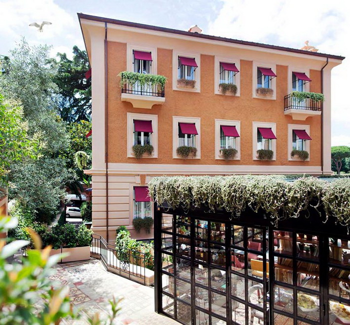 Этот отель в Риме привлекает внимание своей необычной формой и яркой расцветкой. Архитектура здания, построенного в начале 20-го века, выполнена в ретро-классическом стиле. Отель умело отреставрирован, а цветовое оформление фасада приятно радует глаз.