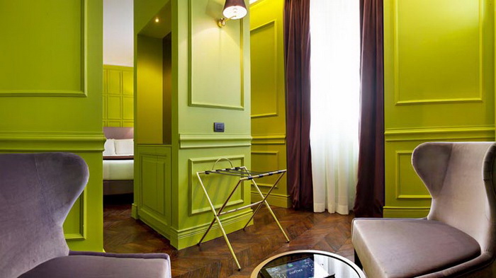 Номера в отеле просторные и светлые. Дизайн интерьера отеля игривый, современный и при этом элегантный. Буйство красок, которые используются в оформлении комнат, придают обстановке оптимизм и радостное настроение. Гармоничное сочетание декора и предметов мебели создают ощущение расслабленного шика, что превращает каждый номер римского отеля в тихий оазис.