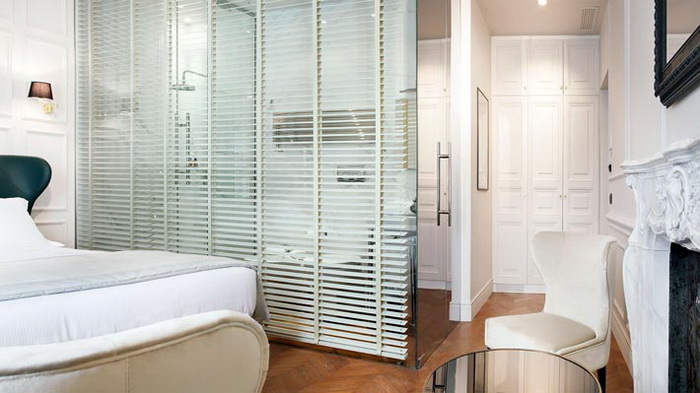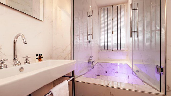 Шикарный отреставрированный паркет, из натурального дерева, подчеркивает элегантность дизайна. Во всех комнатах используются одинаковые предметы декора – бра, люстры, красивые кресла, прикроватные столики и тумбы. Такой прием поддерживает обстановку отеля в одном стилевом направлении. Камины в комнатах добавляют в интерьер уют.
