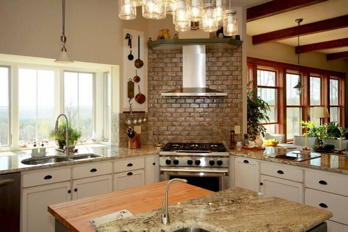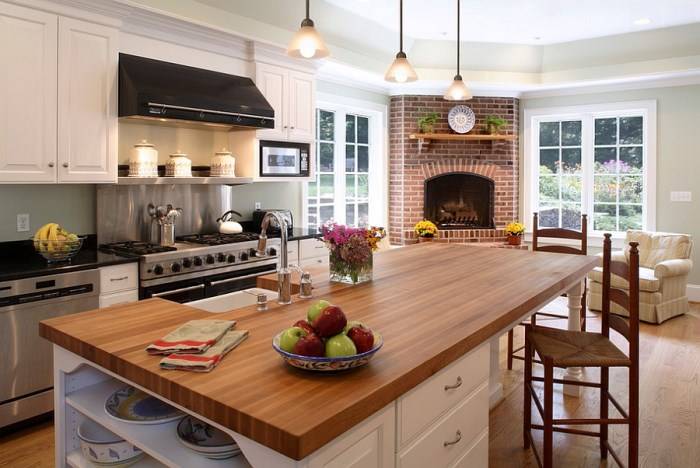Такой вариант, конечно же, не для всех. Однако камин обладает такой особой привлекательностью, так преображает кухню, что порой просто невозможно удержаться! Тем более что сегодня существуют электронные и био-камины, которые можно использовать не только в частном доме, но и в квартире. Большая традиционная кухня выглядит просто очаровательно с харизматической зоной отдыха возле камина в углу!