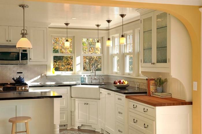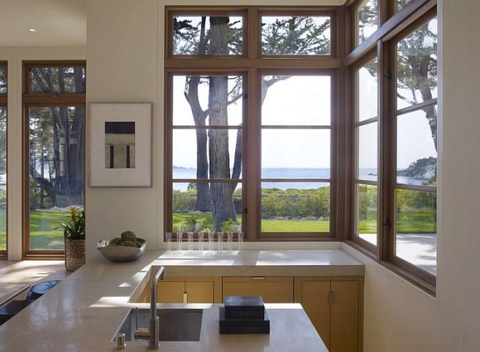 Большие угловые окна принесут в небольшую кухню изобилие света и ощущение уличной свежести. Это относительно простой и модный способ придать кухне открытый и веселый вид.