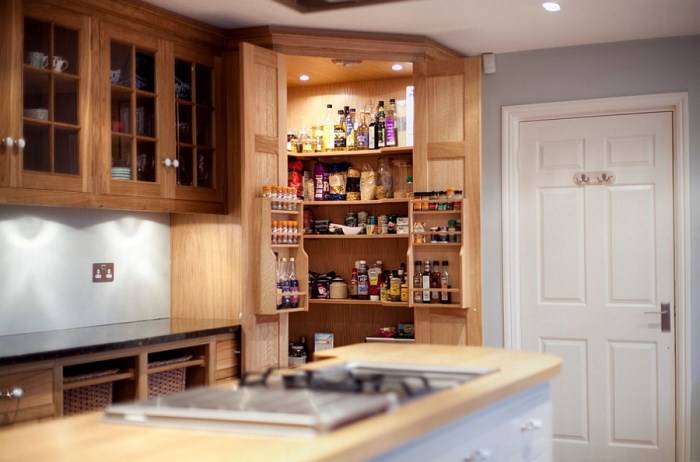 При установке глубокой угловой кладовки у вас отпадет потребность в большой части верхних и нижних кухонных шкафчиков. Кроме того, кладовые очень удобны и придают кухне теплый, уютный вид. Единственный нюанс: важно убедиться, чтобы в помещении или даже в самой кладовой было хорошее освещение, например, такое как на фотографии ниже.