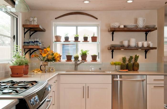 Плавающие угловые полки с широким основанием сегодня находятся на пике популярности. Во-первых, они придают маленькой комнате визуальную воздушность и заставляют ее выглядеть более свежей. Во-вторых, открытые полки позволяют в наилучшем виде представить ваш фарфор и другие декоративные мелочи, делая кухню уютной и приветливой. И наконец, подвешивание плавающих полок занимает сравнительно мало усилий и времени.