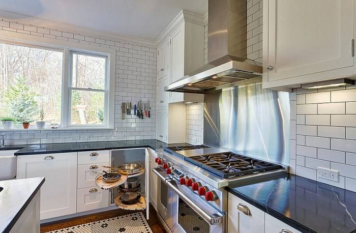 Использование духовки в углу кухни становится все более и более популярным с каждым днем, поскольку позволяет сильно сэкономить драгоценное пространство и придает интерьеру необычный вид. Конечно, сначала необходимо правильно подвести газ и вентиляционную систему, чтобы такая идея заработала, но зато результат однозначно стоит всех затраченных усилий! Окружите этот угол красивыми шкафчиками или полками по обе стороны для получения полного спектра преимуществ.