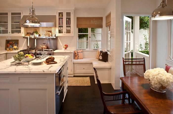 Еще один классический вариант, который просто никогда не выходит из моды! Банкетка на кухне всегда уместна и полезна, причем не только для отдыха, но и для хранения вещей, поскольку может иметь очень вместительные нижние ящики.
