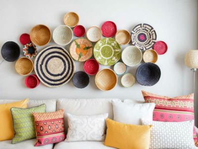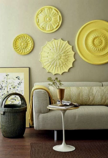 Эффектный способ преображения пустующей стены – составление композиций из декоративных тарелок. Тарелки могут составлять единый стиль, к примеру ретро, минимализм, гламур или подчеркивать хобби хозяина дома, тогда при выборе тарелок необходимо подбирать все предметы в единой образцово-показательной направленности с изображением – киногероев, путешествий, гор, морей и т.д. Более подробно о составлении композиций из декоративных тарелок можно почитать в этом обзоре.