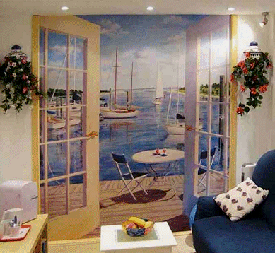 Фальш-окно подойдет тем помещениям, в которых по каким-либо причинам не получается создать настоящее окно. Декоративное окно может быть выполнено из зеркал или настенной наклейки с изображением окошка. Чтобы окно казалось более реалистичным, выше него следует закрепить несколько светильников с лампами дневного света.