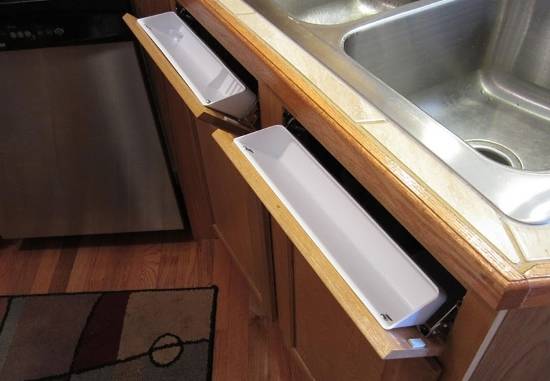 Установка выдвижных ящиков над полом и под раковиной, а также использование боковых панелей на шкафах и пространства между верхними и нижними шкафчиками позволит вам удобно хранить разные кухонные принадлежности, для которых обычно трудно найти свободное место.