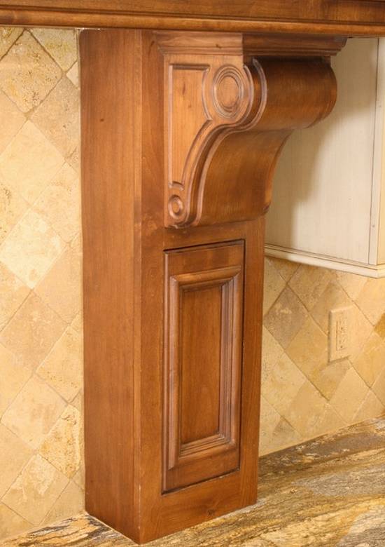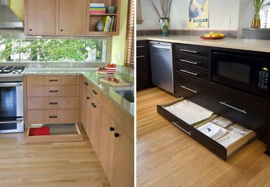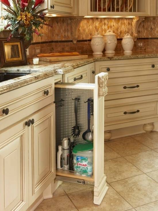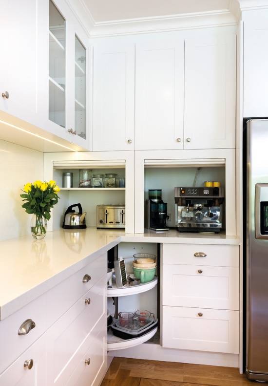 На последней фотографии вы можете видеть сразу 2 примера практичного использования пространства кухни: скрытые боковые отсеки между верхними и нижними шкафчиками, а также вращающуюся полку, которая позволяет максимально удобно использовать угол кухни.