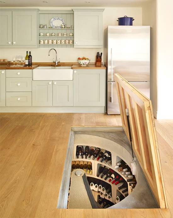 Начнем мы с самых фантастических секретных хранилищ для кухни, которые, правда, могут быть доступны далеко не всем домовладельцам. Например, подпольный винный погреб невозможно оборудовать в квартире во многоэтажке, а функциональная плитка от бренда Droog может украсть несколько сантиметров пространства у и без того маленькой кухни. Завершают нашу тройку самых креативных секретных хранилищ для кухни выдвижные ящики для специй, скрывающиеся за декоративными колоннами в кухонном шкафчике.