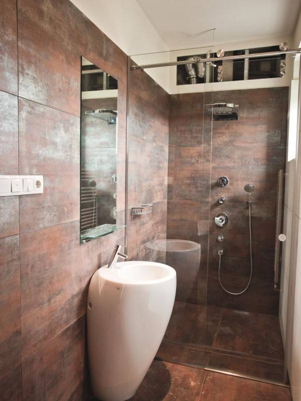 Чем покупать узкую, но громоздкую душевую кабину, лучше организовать душ в части ванной комнаты, отделив ее прозрачными перегородками и низеньким напольным бордюром. Во-первых, так у вас появится возможность получить больше места для принятия душа, чем предлагает обычная душевая кабина. А во-вторых, такой ход смотрится гораздо более эстетично с точки зрения дизайна.