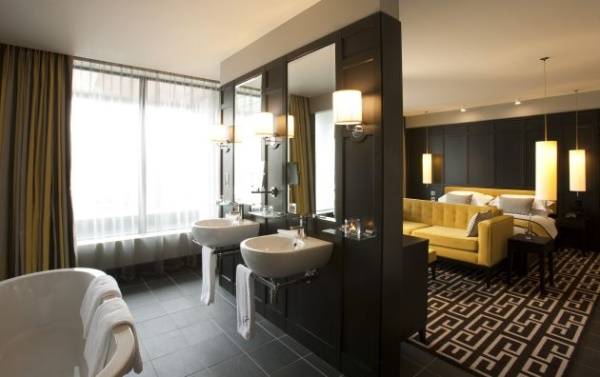 Конечно, такой дизайнерский ход подходит далеко не всем, но разве плохо вместо двух маленьких комнат получить одно просторное помещение? Кроме традиционного объединения маленькой ванной с туалетом, дизайнеры предлагают также подключать ванные комнаты к спальням и комнатам отдыха. Применение изысканных материалов при этом обязательно, ведь открытая планировка спальни и ванной сама по себе предполагает оформление в стиле люкс. А вот раздвижные перегородки и шторы для разделения пространства можно использовать по вашему усмотрению.