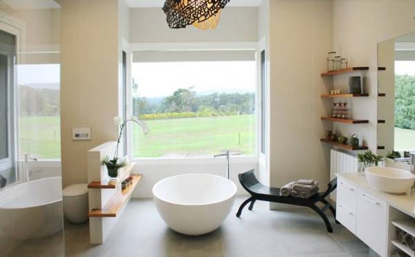 Не хватает места для отдельно стоящей ванны? Тогда попробуйте объединить ее с настенным выступом, как это показано на рисунке ниже. В любом случае привычные угловые и объединенные со стеной ванны выходят из моды.