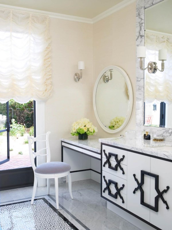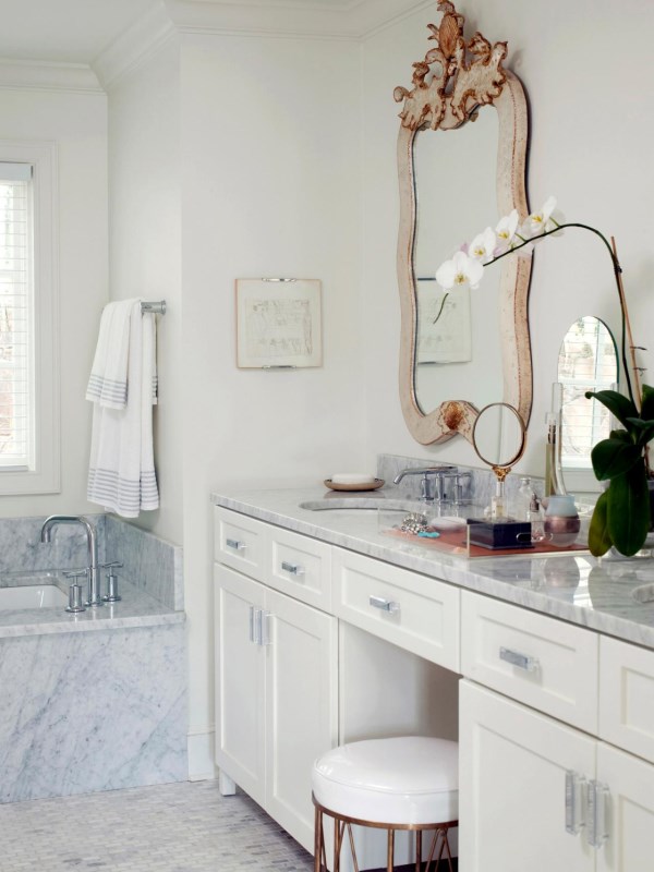 Изобилие мрамора в этом пространстве вызывает мгновенное ощущение роскоши — как если бы у вас дома появился свой собственный шикарный спа-салон! Белая мебель и стены красиво выделяют не только узор мрамора, но и эффектное старинное зеркало, тогда как зона отдыха со стулом придает интерьеру нотку гламура.