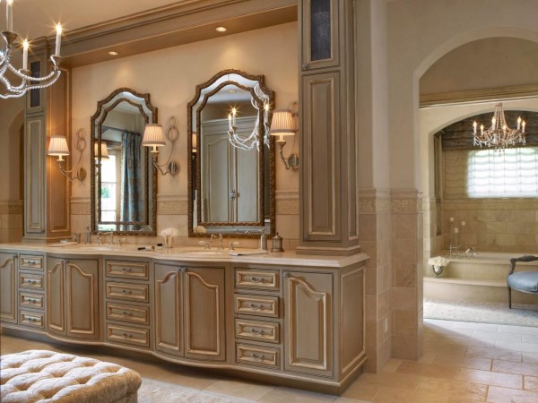 Признаком истинной роскоши является мебель для ванной, выполненная на заказ. Начиная с изысканной отделки шкафчиков и зеркал, и заканчивая турецкой плиткой и эффектным молдингом, каждая часть этой ванной комнаты была создана специально для этого экспансивного пространства. Прекрасно вписывающиеся бра и люстры добавляют интерьеру изысканный штрих.