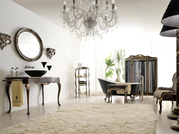 Что может быть более роскошным, чем ощущение, когда в ванной комнате вы чувствуете себя также как и в любой другой? Полный набор мебели, ванна в ретро-стиле, мягкий ковер, красивые этажерки и великолепные люстры превращают эту ванную в зону отдыха, куда хочется возвращаться вновь и вновь.
