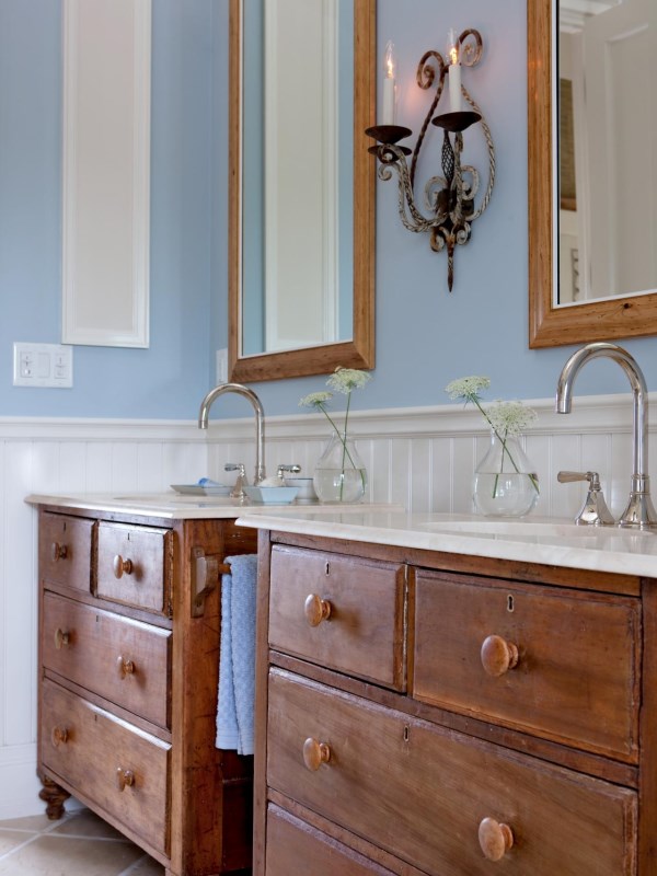 Для создания уютного деревенского вида этой ванной комнаты дизайнер применил пару антикварных комодов. Преподнеся их в сочетании с мраморной столешницей, он создал редкий образец загородного шика в интерьере. Но самое приятное здесь заключается в том, что вы сами можете изготовить подобную мебель для ванной из своего старого комода. Фотографии ниже подскажут вам, как это сделать.