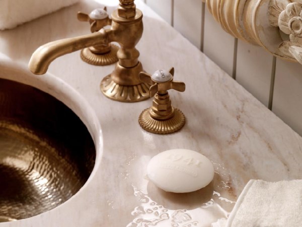 Если роскошь предыдущей ванной комнаты кроется в тонких деталях, то здесь же все наоборот. Чтобы придать помещению чувство стиля и богатства, все элементы этой ванной были выполнены в латуни, меди или золоте, теплый блеск которых поразительно гармонирует с холодной мраморной столешницей.