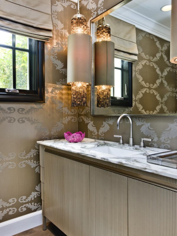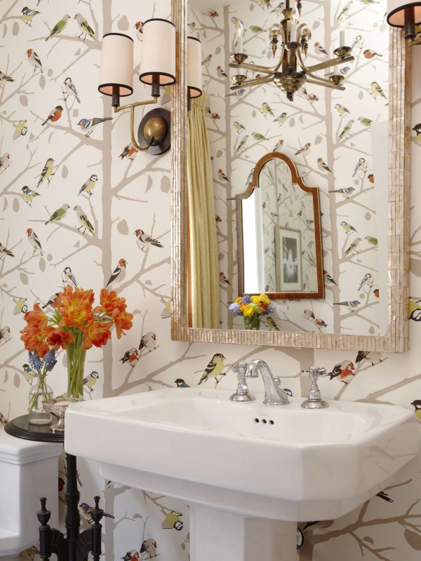 Конечно, главным элементом дизайна этой ванной комнаты являются яркие обои, но обратите внимание, насколько изысканно на таком фоне смотрится раковина-пьедестал и блестящая отделка большого зеркала!