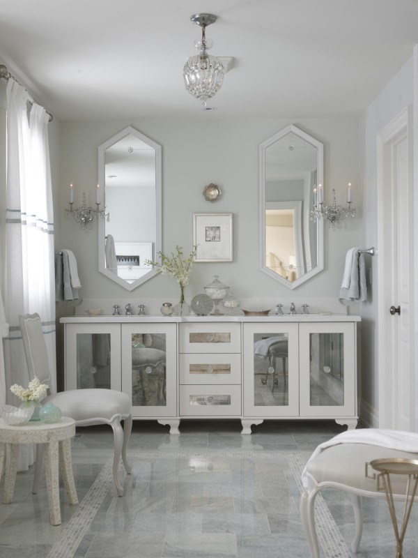 В этой ванной комнате используется светлая дымчатая цветовая палитра, которая способствует созданию приятной и расслабляющей атмосферы. Мебель со стеклянными дверцами и винтажные зеркала вносят в комнату изысканный стиль и блеск.