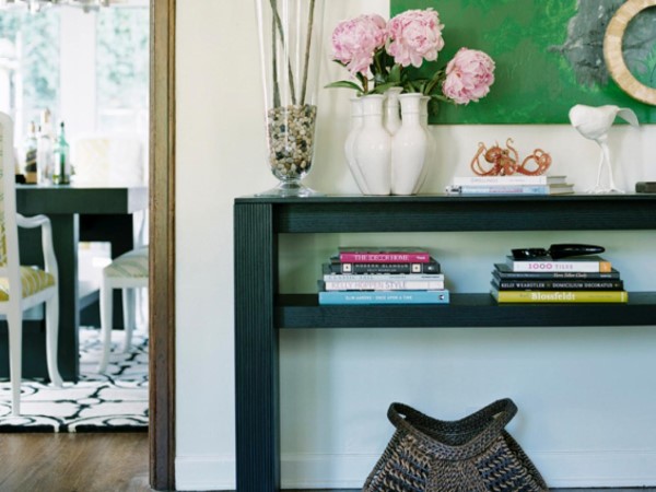 Использование одной или нескольких книг в качестве подставки — это простой и очень эффектный трюк для выделения самых интересных, но не самых крупных элементов декора. Более того, книги не только привлекают внимание к стоящим на них украшениям, но и придают красивый рельеф всей композиции декора в целом.