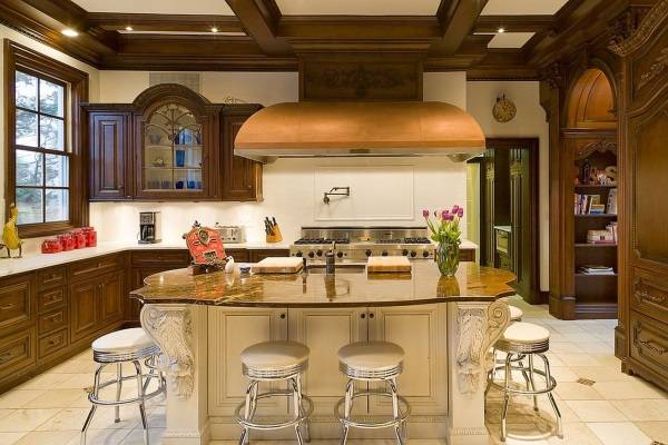 Новый дом Ким и Канье в закрытом поселке Хидден-Хилс, Лос-Анджелес имеет 8 спален, 10 ванных комнат, 2 бассейна, 2 спа-зала и виноградник. Стоит такая роскошь $ 20 млн. и можно понять почему, взглянув на эту огромную, отделанную мрамором кухню во французском кантри стиле.