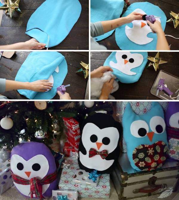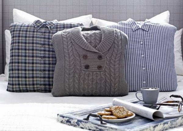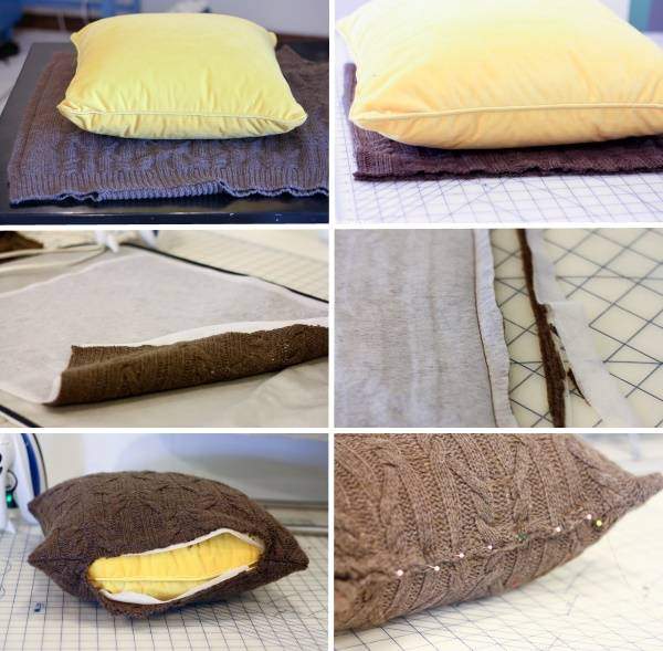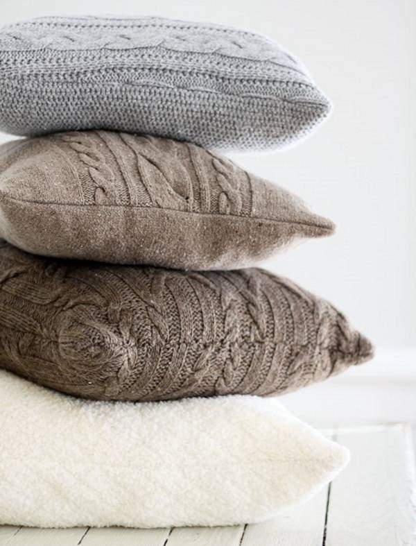 А если вы не обладаете навыком вязания или хотите побыстрей украсить свой диван в гостиной декоративными подушками, то можете использовать старый вязаный свитер и пошить подушки своими руками, следуя за пошаговой инструкцией ниже.