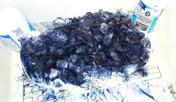 Прежде всего ткань следует хорошенько промочить водой и выложить на решетку, установленную над раковиной или другой имеющейся ёмкостью. Ткань вовсе необязательно ровно расстилать по поверхности решетки, а даже наоборот — лучше скомкать её, чтоб рисунок получился неоднородным. Хотите сделать одновременно несколько наволочек? Смело сваливайте их в мокрую кучу! Затем поверх ткани горкой выкладывается лёд и густо посыпается порошковым красителем.