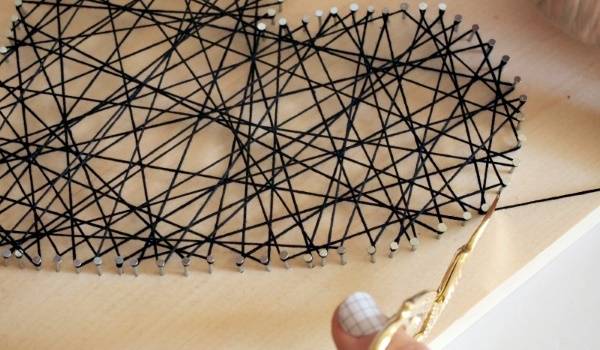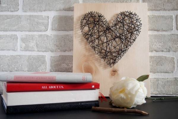 Пусть День святого Валентина уже прошел, но для романтичного признания в любви просто не бывает неподходящего времени. С применением ниток, гвоздей и деревянной подложки можно создать удивительно красивое произведение искусства, которое непременно порадует вашу вторую половину и станет достойным украшением любого интерьера.
