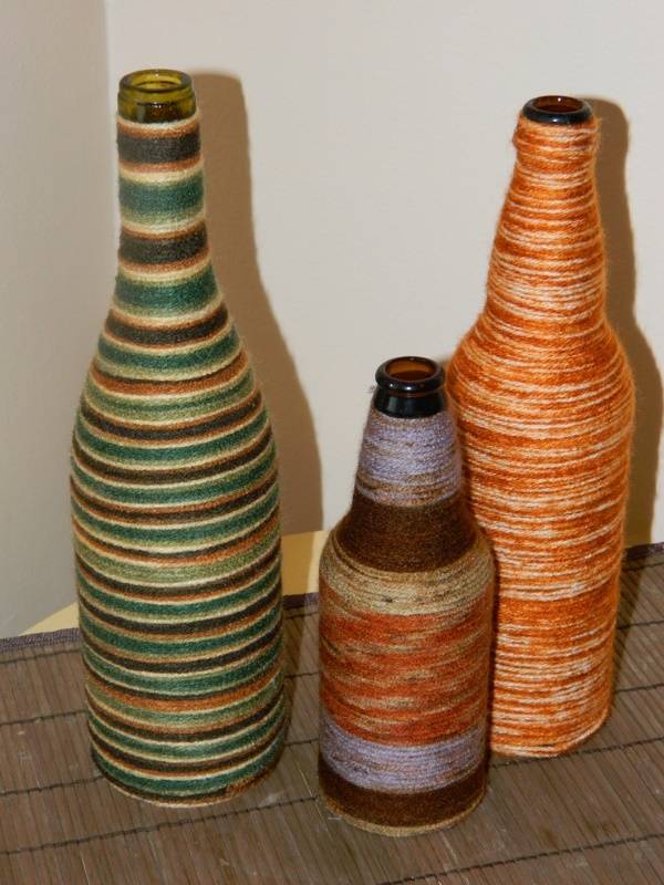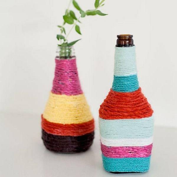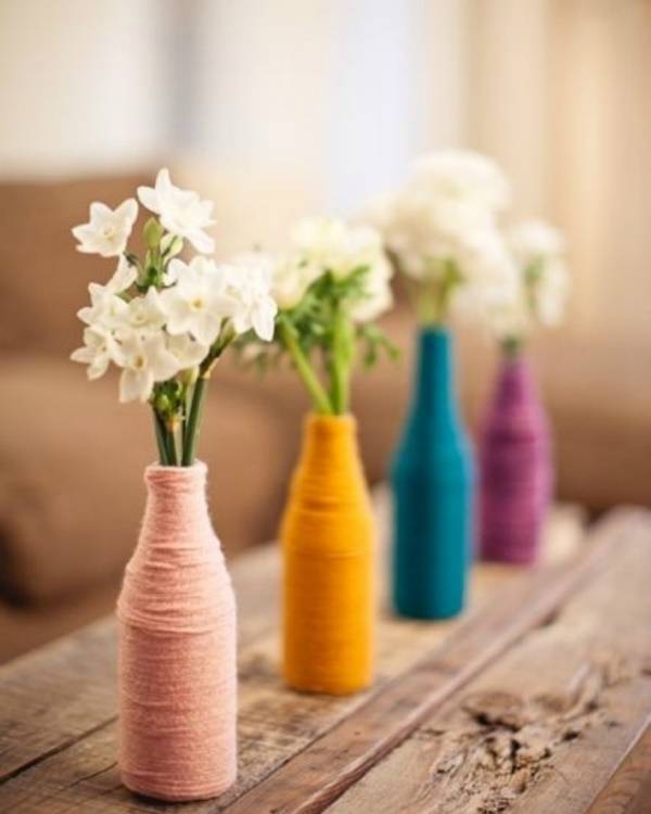 Надоела старая ваза? Прежде чем покупать новую, присмотритесь к этим оригинальным способам украсить вазу или даже создать новую из обычной бутылки с применением ниток! Идея хороша тем, что не занимает много времени и предлагает безграничное число цветовых вариаций на ваш выбор.