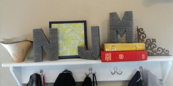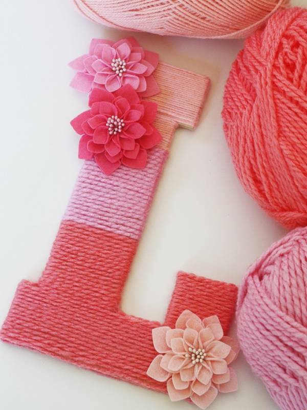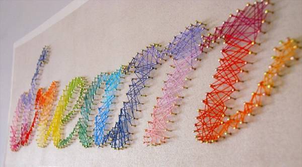 Плотный картон, ножницы и нитки — все, что необходимо для создания ярких и разноцветных букв, которые могут украсить комод, подоконник, полку или диван в любой комнате вашего дома. Для создания более толстых букв используйте две части из картона с прослойкой из какого-нибудь пеноматериала (например, пенополиэтилен) между ними. Детям понравится!