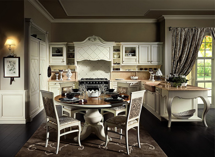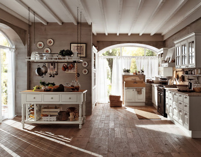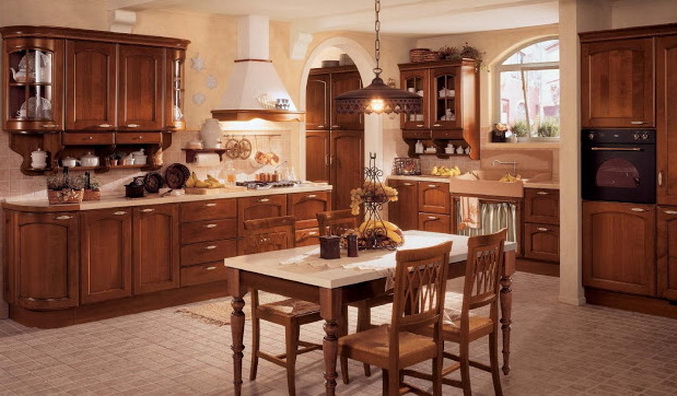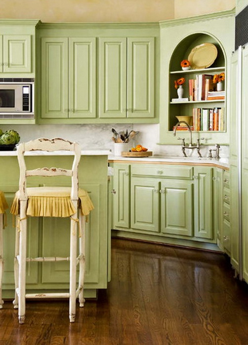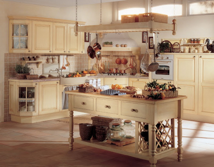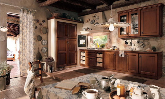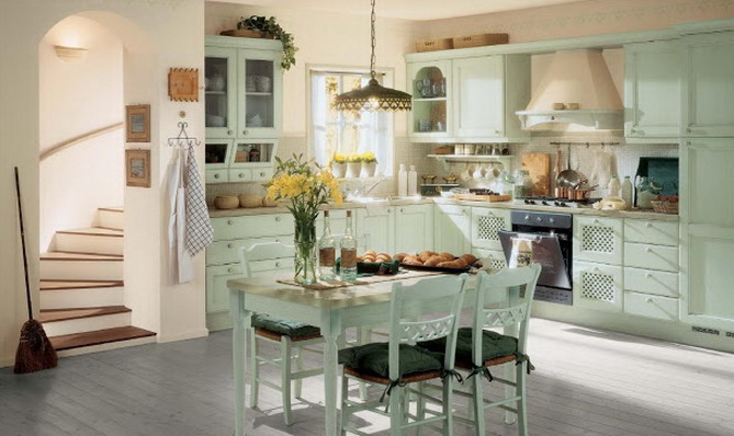 Стиль Прованс – отличный способ создать на кухне уютную и теплую атмосферу. Материалы для оформления помещения кухни только натуральные. На стенах штукатурка, камень или керамическая плитка. Потолок с балками. На полу деревянные доски или терракота. Кухонная мебель деревянная, крашенная, оформлена, как правило в светлых цветах, но может быть зеленой, синей и коричневой. Дверцы кухонных шкафов расписывают цветочными узорами или же они могут быть в решетку и стеклянными.