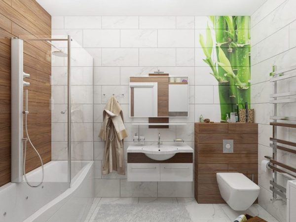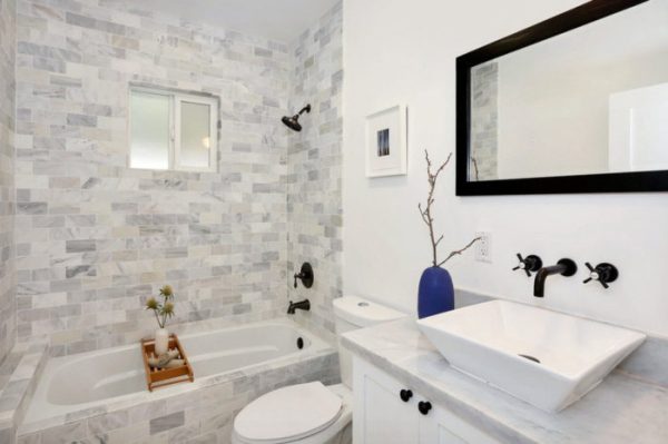 В небольшом помещении следует располагать плитку уменьшенных размеров или же с повторяющимся узором, процесс выкладки занимает значительно больше времени, но в конечном итоге удастся создать ощущение перспективы на стене.