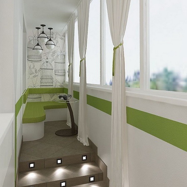 Если балкон расположен не в жилой комнате, а на кухне и выходит, например, на север или запад, то лучше всего обустроить там что-то вроде небольшого летнего рабочего кабинета. Для этого можно использовать в оформлении оттенки спокойных голубых и зелёных тонов.