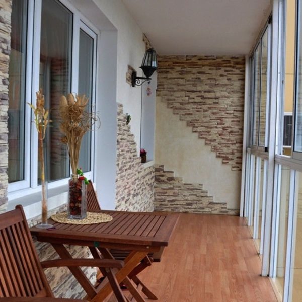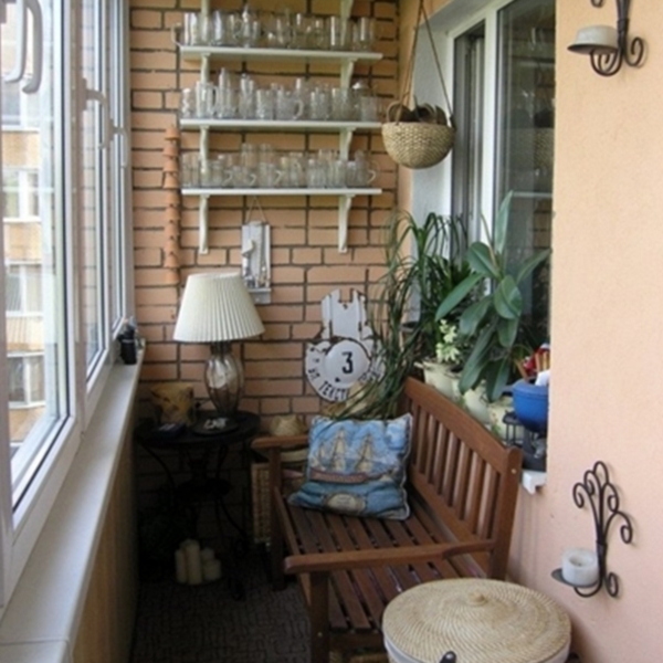 На одной из стен балкона можно разместить картину (наклейку) с изображением пейзажа, например, широко раскинувшейся реки или моря. На любом, даже самом маленьком балконе, обязательно поместятся небольшой стол и компактный стул, можно складной.