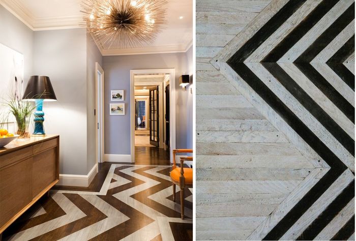 Классика узорных полов — это паркет. Мозаичный шеврон позволяет создать огромное количество узоров. Для полов можно использовать шаблоны или создать схему самостоятельно. Главное — правильно определить направление углов и цветовое сочетание.