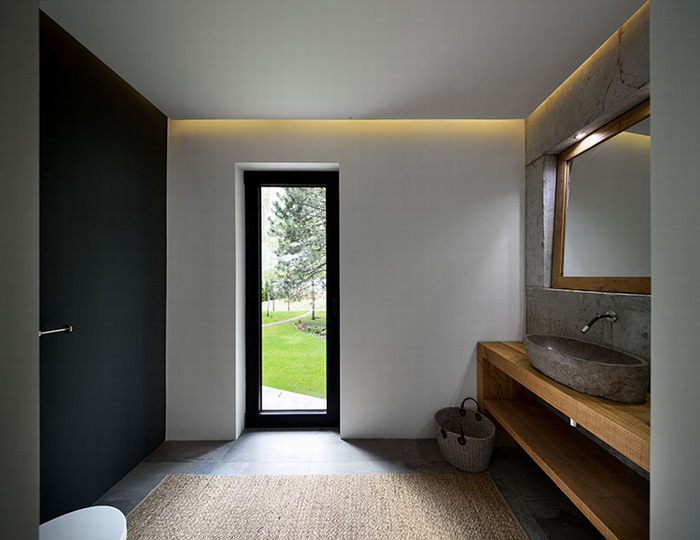 «В доме принципиально не устанавливали телевизор, вместо голубого экрана у заказчиков есть изумительный вид на природу, камин и баня. Мягкая мебель нарочно ориентирована по направлению к окнам», – ​объясняет Анна Пахомова. Принцип открытости воплощен едва ли не во всех помещениях. Душевая отделена от гостиной прозрачной стеклянной перегородкой, в санузле унитаз расположен прямо напротив окна.