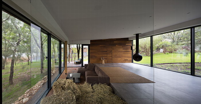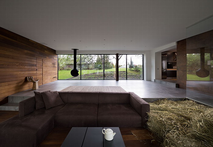 Кроме дивана, журнального столика и кресла в виде руки в гостиной нет никакой мебели, главный герой здесь – ​пространство. Неожиданный элемент интерьера – ​сеновал. Хозяин вспомнил, что как-то, будучи в деревне, после бани отдыхал на сене, и ему понравились эти ощущения. А так как на улице сеновал был бы функционален только в сухую погоду, стог сена поместили прямо посреди гостиной.