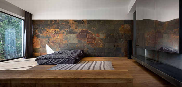 Стена в спальне облицована плиткой Apavisa, имитирующей природный сланец
